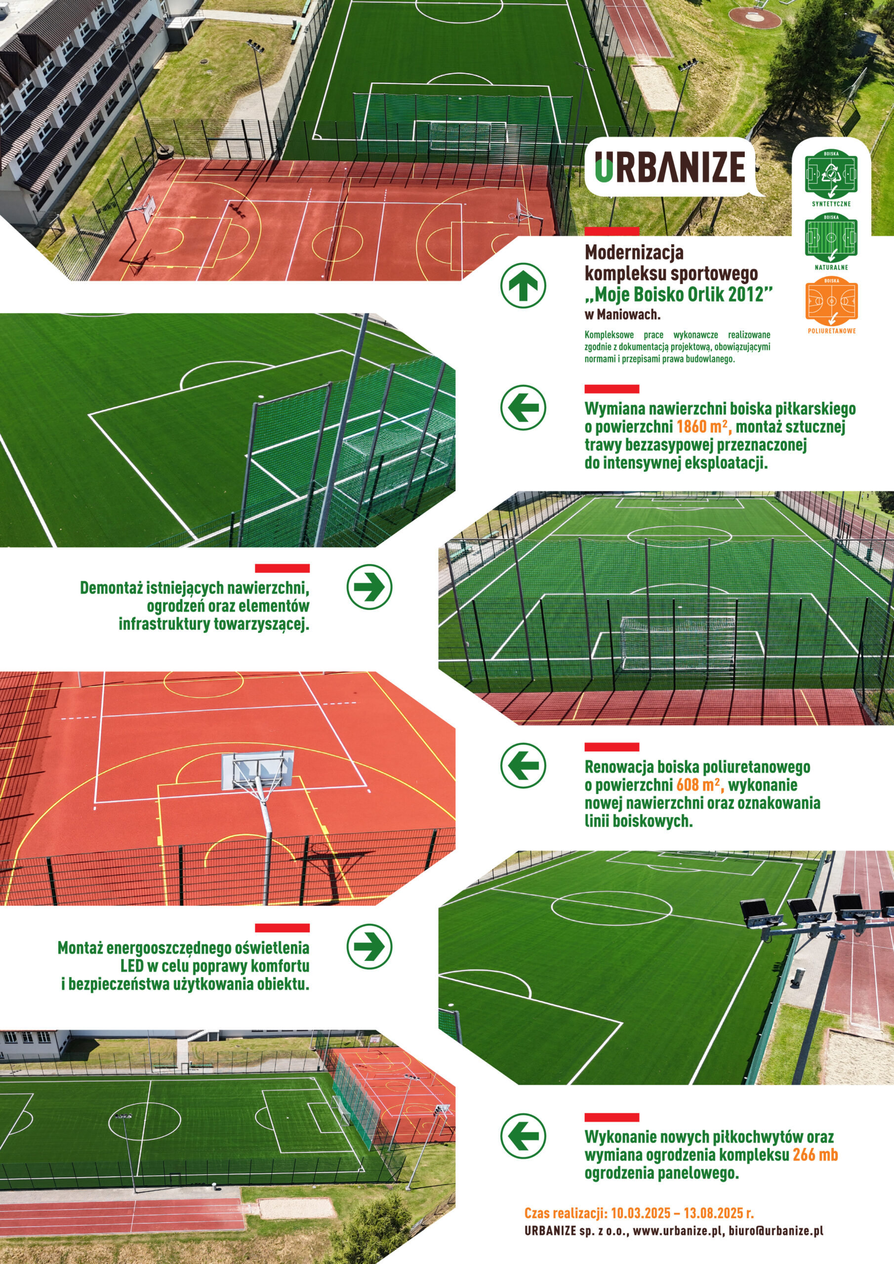 Zrealizowany projekt potwierdza doświadczenie firmy URBANIZE sp. z o.o. w zakresie modernizacji obiektów sportowych oraz realizacji inwestycji publicznych prowadzonych zgodnie z wymaganiami dokumentacji projektowej i harmonogramu.
