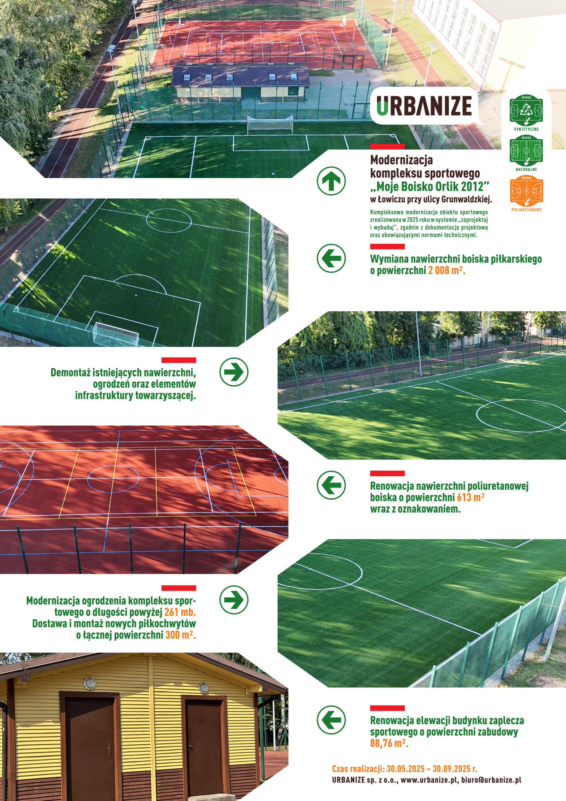 W okresie od maja do września 2025 roku firma URBANIZE sp. z o.o., jako główny wykonawca, zrealizowała modernizację kompleksu sportowego „Moje Boisko – Orlik 2012” w Łowiczu przy ul. Grunwaldzkiej w systemie „zaprojektuj i wybuduj”. Inwestycja obejmowała opracowanie dokumentacji projektowej oraz realizację robót budowlanych, prowadzonych zgodnie z dokumentacją projektową oraz obowiązującymi normami technicznymi.