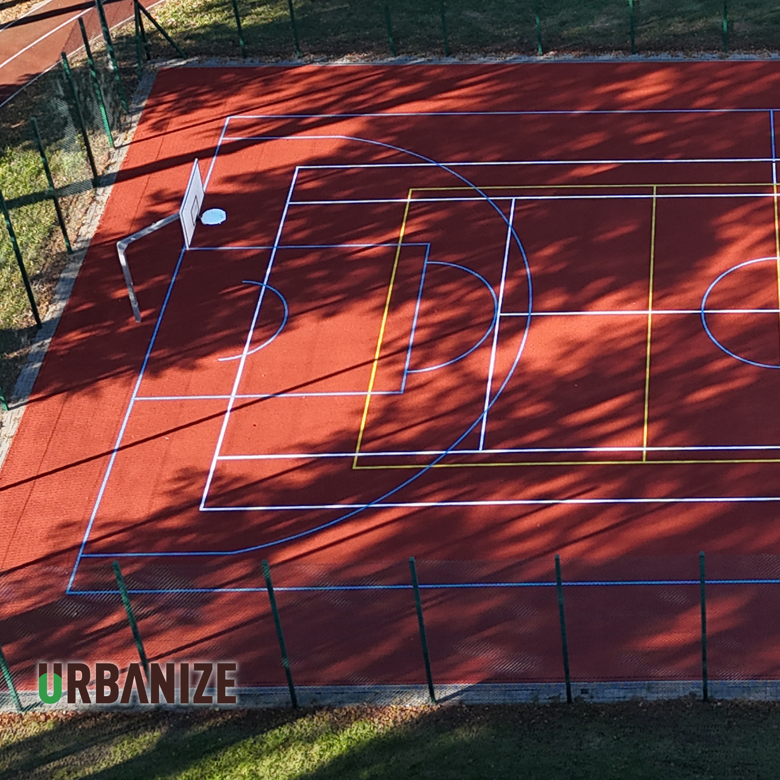 – renowację nawierzchni poliuretanowej boiska o powierzchni 613 m² wraz z oznakowaniem linii boiskowych,